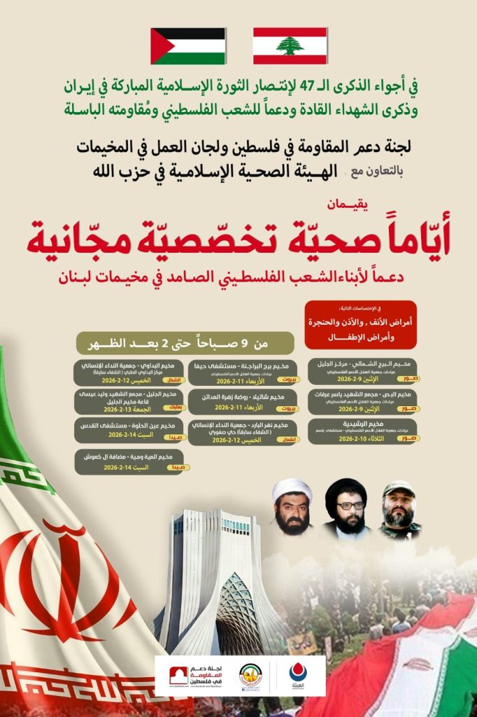 في أجواء الذكرى ال47 اإنتصار الثورة الإسلامية المباركة في إيران وذكرى الشهداء القادة، ودعما للشعب الفلسطيني ومقاومته الباسلة، لجنة دعم المقاومة في فلسطين ولجان العمل في المخيمات بالتعاون مع الهيئة الصحية الإسلامية في حزب الله يقيمان اياما صحية تخصصية مجانية دعما لأبناء الشعب الفلسطيني الصامد في مخيمات لبنان في الاختصاصات التالية: