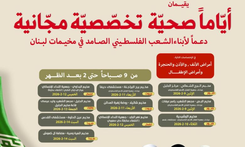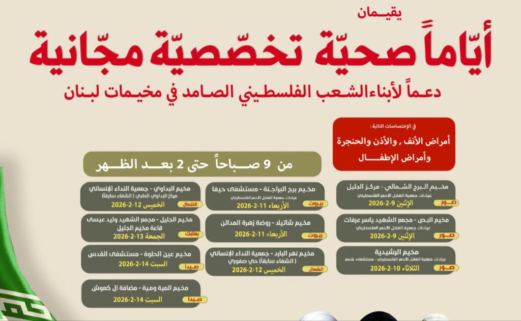 مخيم برج البراجنة : جمعية الهلال الأحمر الفلسطيني مستشفى حيفا االأربعاء 11-2-2026 من الساعة 9 صباحا حتى الساعة 2 بعد الظهر.