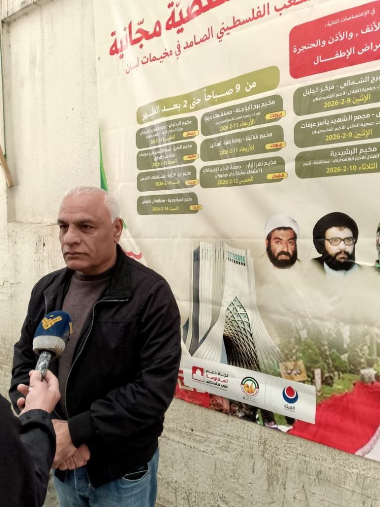 في أجواء الذكرى ال47 اإنتصار الثورة الإسلامية المباركة في إيران وذكرى الشهداء القادة، ودعما للشعب الفلسطيني ومقاومته الباسلة، تابعت لجنة دعم المقاومة في فلسطين ولجان العمل في المخيمات بالتعاون مع الهيئة الصحية الإسلامية في حزب الله الايام الصحية التخصصية المجانية دعما لأبناء الشعب الفلسطيني الصامد في مخيمات لبنان في الاختصاصات التالية: أمراض الأنف، الأذن والحنجرة وأمراض الأطفال في جمعية النداء الانساني- مركز البداوي الطبي بمخيم البداوي، وجمعية النداء الانساني، حي صفورية بمخيم نهر البارد يوم الخميس 12-2-2026 وقد تمت معاينة 306مرضى